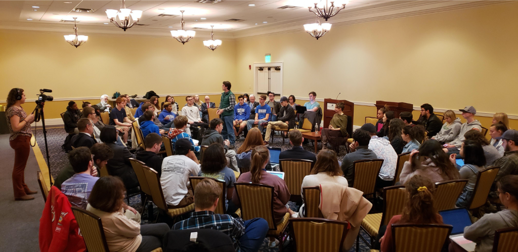 We encourage everyone in the room (whether on campus or in a Zoom room) to speak, ask questions, and share their personal stories and beliefs. Within these debates there is always a presumption of good faith and positive intent. We always say everyone is encouraged to speak and participate, whether they are a college student, college janitor or the college president; all of those types of individuals and more have actually participated in debates!